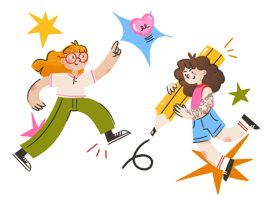 Milena é ilustradora e vive para espalhar cores e encantamento pelo mundo, com um carinho extra pelos animais. Com três livros infantis ilustrados e uma colaboração editorial para a revista SuperInteressante, seu trabalho transita com naturalidade do universo lúdico ao adulto.Gabi é ilustradora, designer e diretora de arte. Sua experiência inclui a criação dos universos gráficos das novelas infantis A Caverna Encantada e a Infância de Romeu e Julieta. Traz consigo uma camada extra de sensibilidade, afeto e diversão que vai além do design convencional.